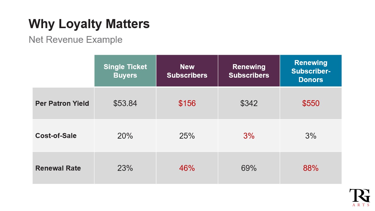 At TRG Arts we’ve seen it in our clients’ and aggregated data since the beginning of our firm’s history, and regularly tell the story in this simple table based on a real performing arts organization’s data: